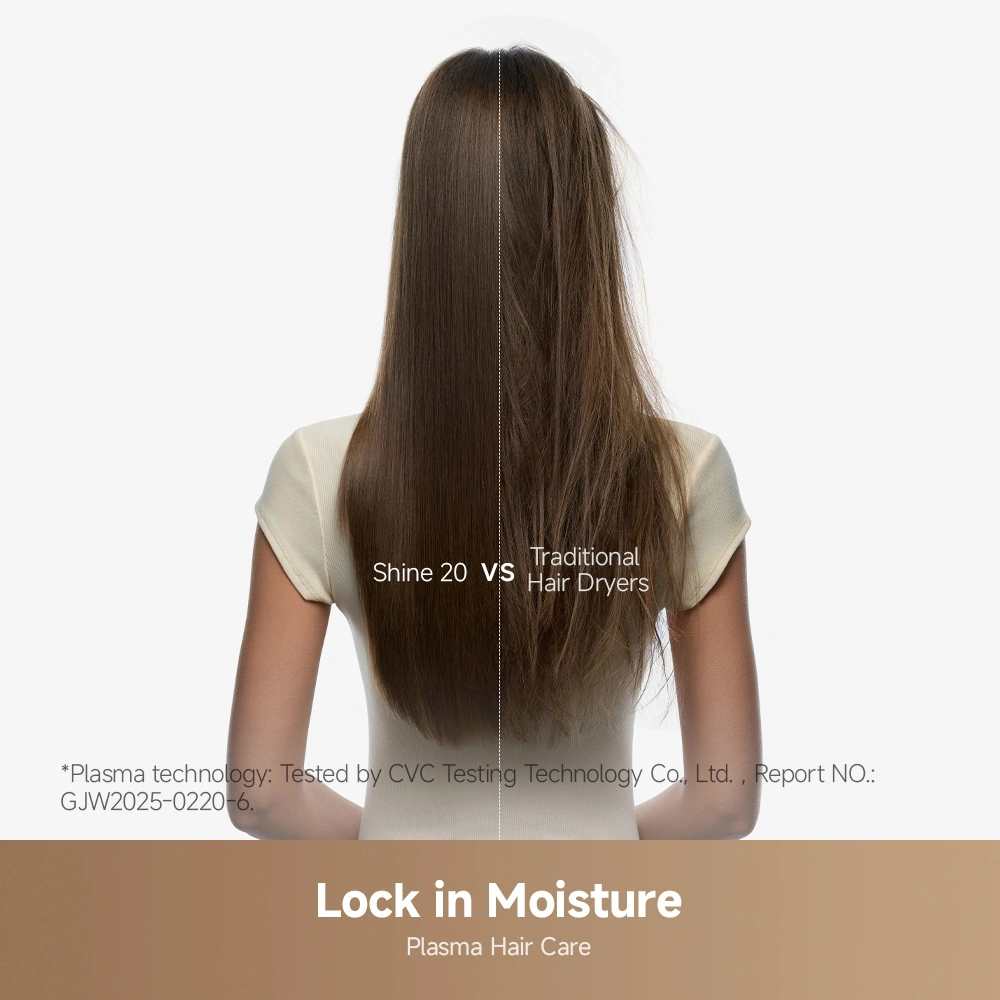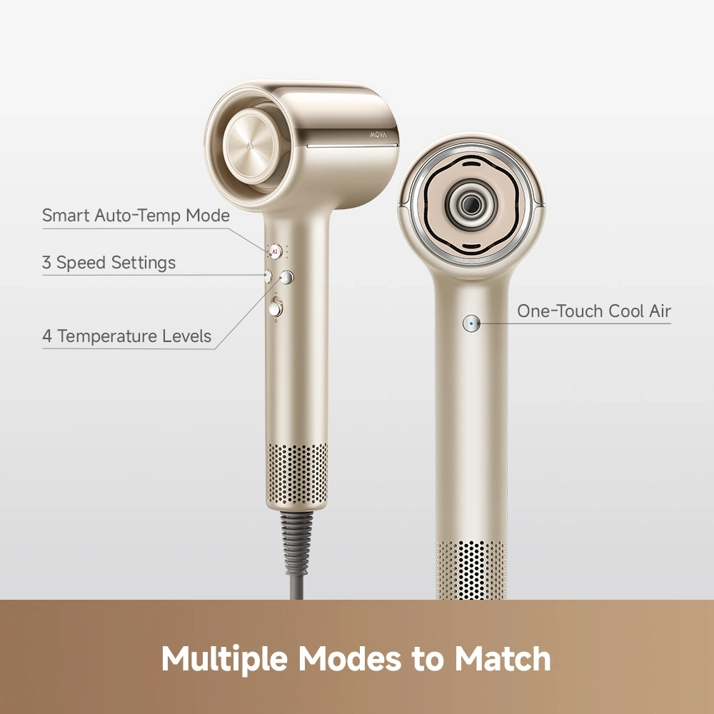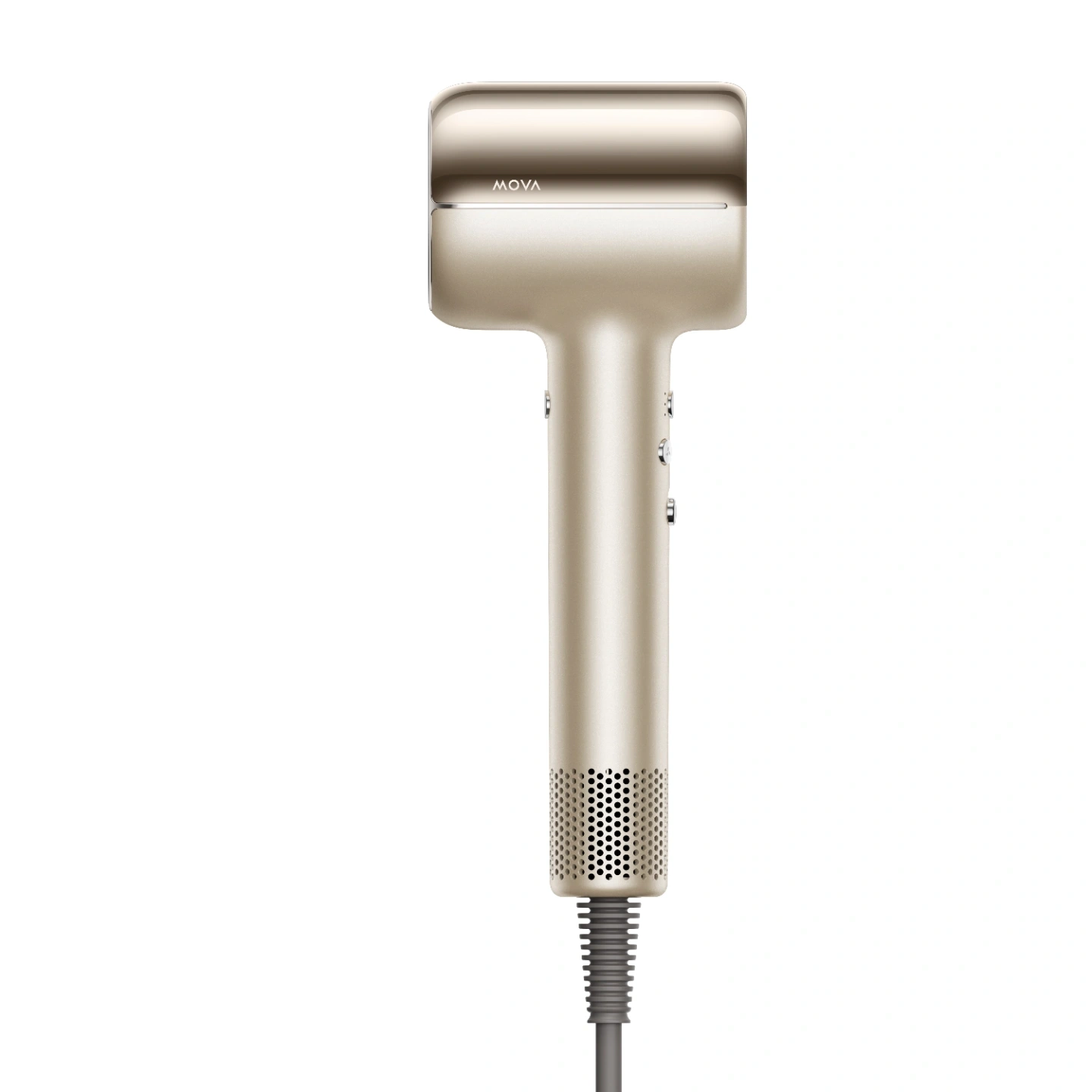 The MOVA Shine 20 delivers fast, gentle, and even drying for the whole family. A TOF (Time-of-Flight) sensor helps keep a scalp-safe 55 °C by regulating heat based on distance, while AeroBlossom™’s flower-shaped outlet smooths airflow for quieter, uniform results. It also auto-recognizes nozzles and adjusts modes, and uses advanced plasma conditioning to lock moisture, reduce static, and remove odors. Available in Gold.